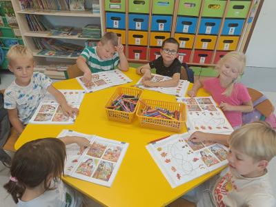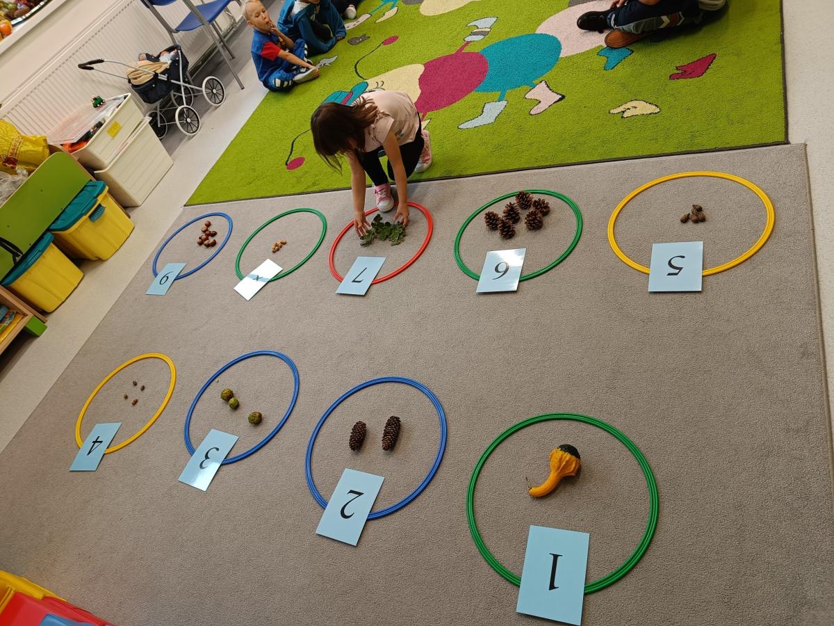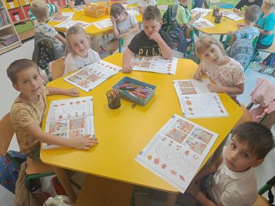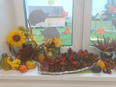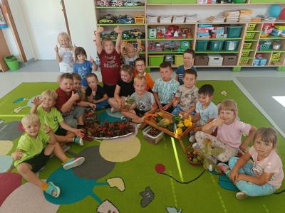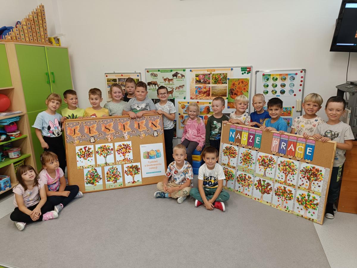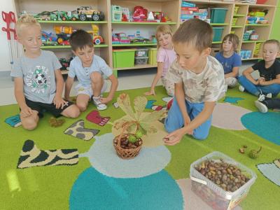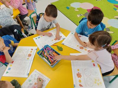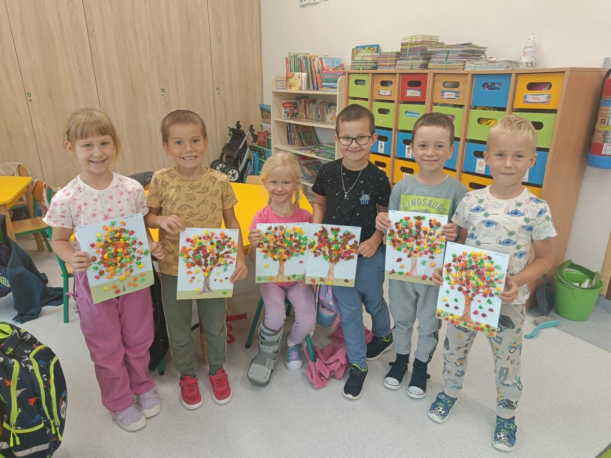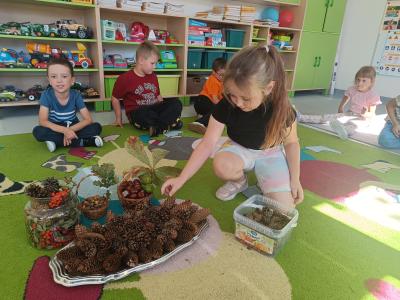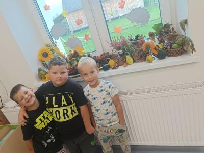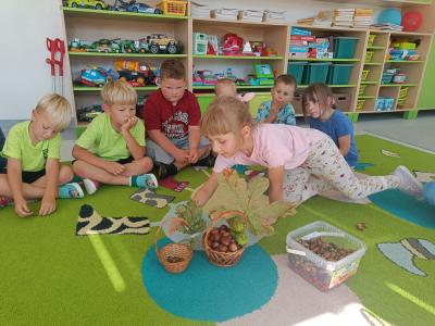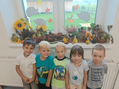 Dzieci z radością odkrywają uroki tej pory roku – zbierają kasztany, żołędzie i barwne liście, tworzą prace plastyczne, uczą się jesiennych wierszyków i piosenek. W sali pojawił się także jesienny kącik na parapecie, w którym znalazły swoje miejsce skarby przyniesione przez dzieci. Teraz każdy dzień w przedszkolu ma w sobie odrobinę jesiennej magii.