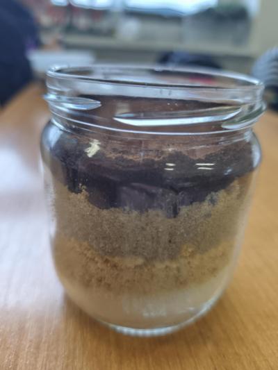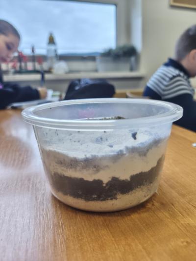 Podczas drugiej lekcji uczniowie przystąpili do części praktycznej czyli do tworzenia modeli profili glebowych- zarówno jadalnych, jak i niejadalnych. Do wykonania jadalnych gleb wykorzystali różnorodne produkty spożywcze, takie jak: pokruszone herbatniki, biszkopty, płatki, jogurt, czekoladę czy żelki, które tworzyły kolejne warstwy gleby.