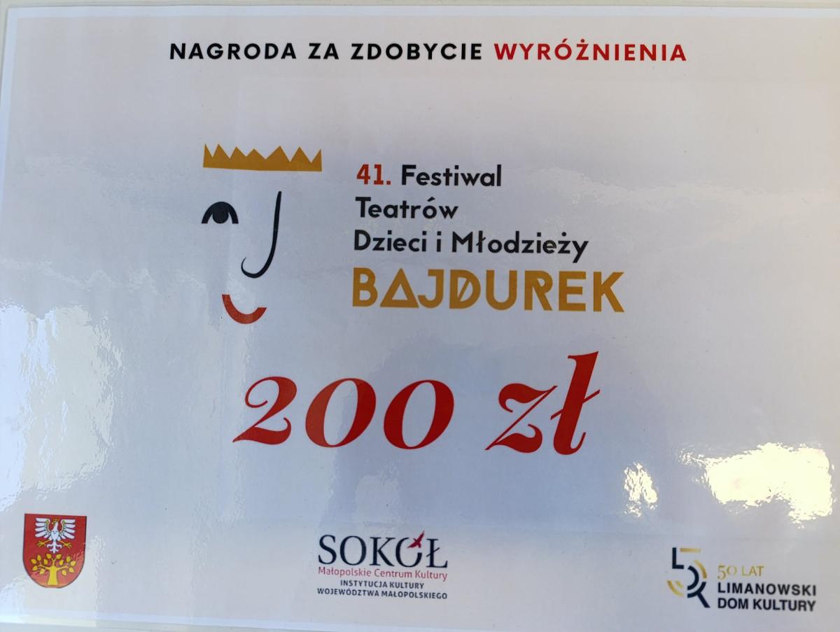 Wyróżnienie podczas powiatowych eliminacji 41. Festiwalu Dzieci i Młodzieży BAJDUREK