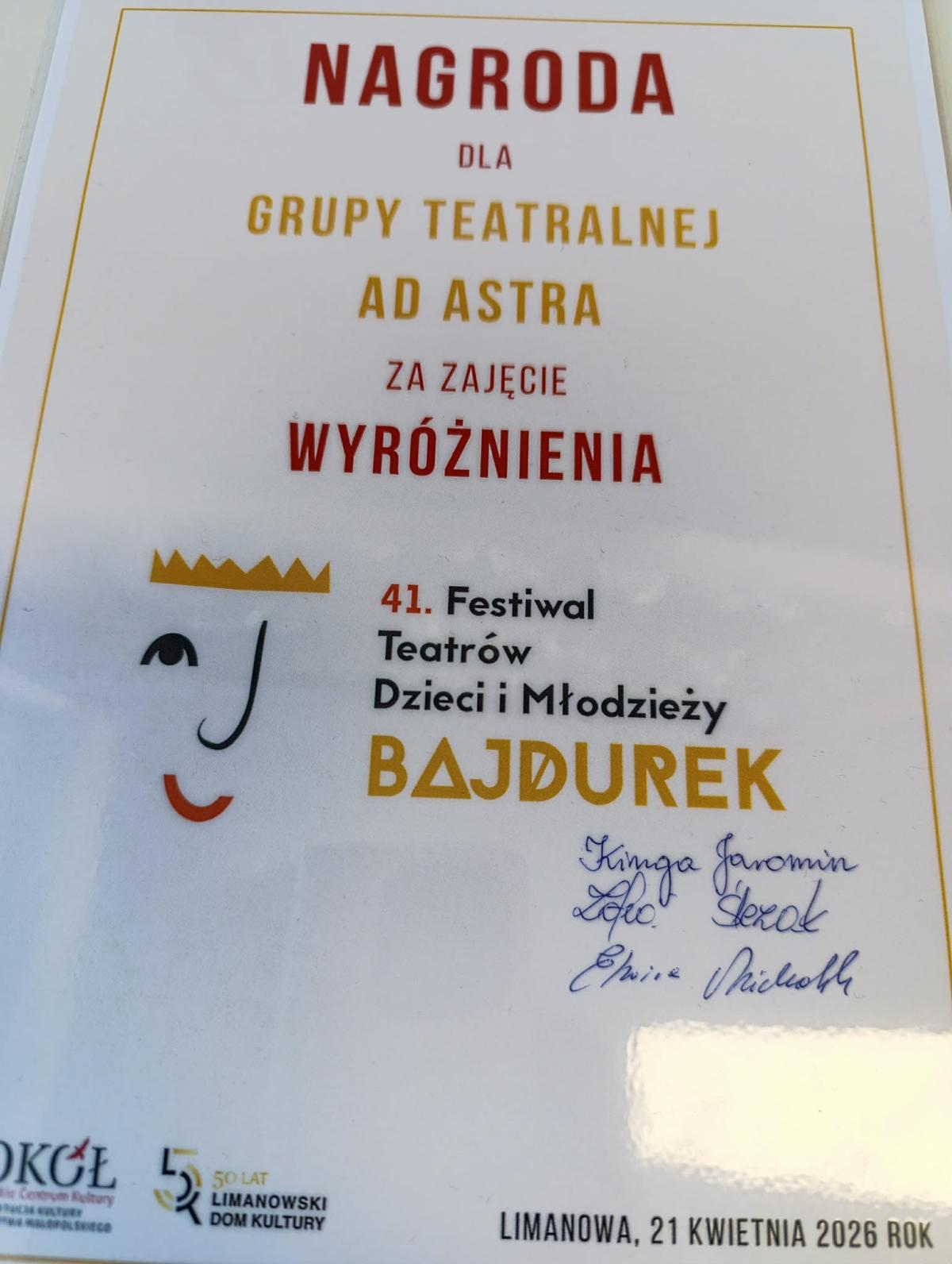 Spektakl „Buty” przyniósł naszej grupie teatralnej „Ad astra” wyróżnienie podczas powiatowych eliminacji 41. Festiwalu Dzieci i Młodzieży BAJDUREK. Na deskach Limanowskiego Domu Kultury nasi uczniowie odważnie podjęli temat bardzo bliski każdemu nastolatkowi. Przyjrzeli się rzeczywistości oceniania i wynikającej z niej presji. Mówili o samotności młodych, szczególnie wówczas, gdy popełniają błędy.