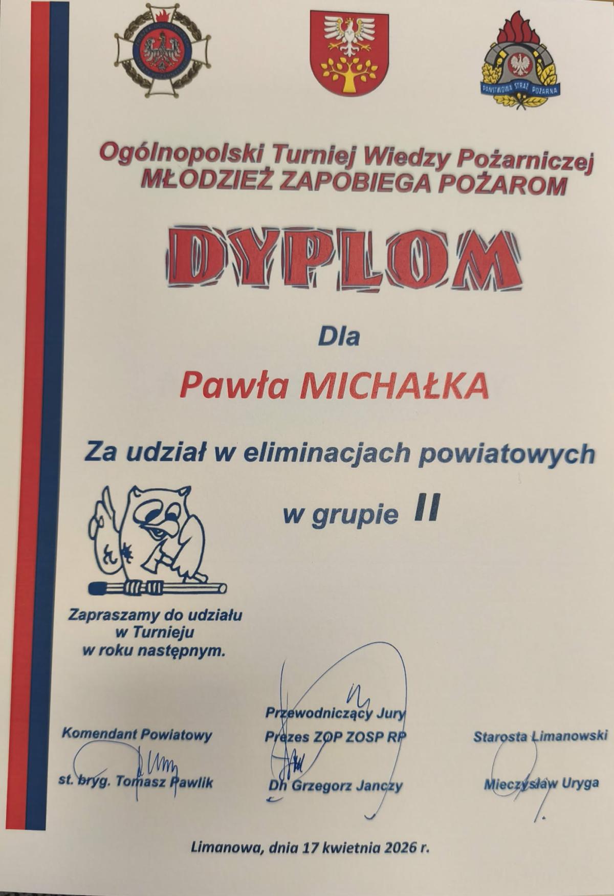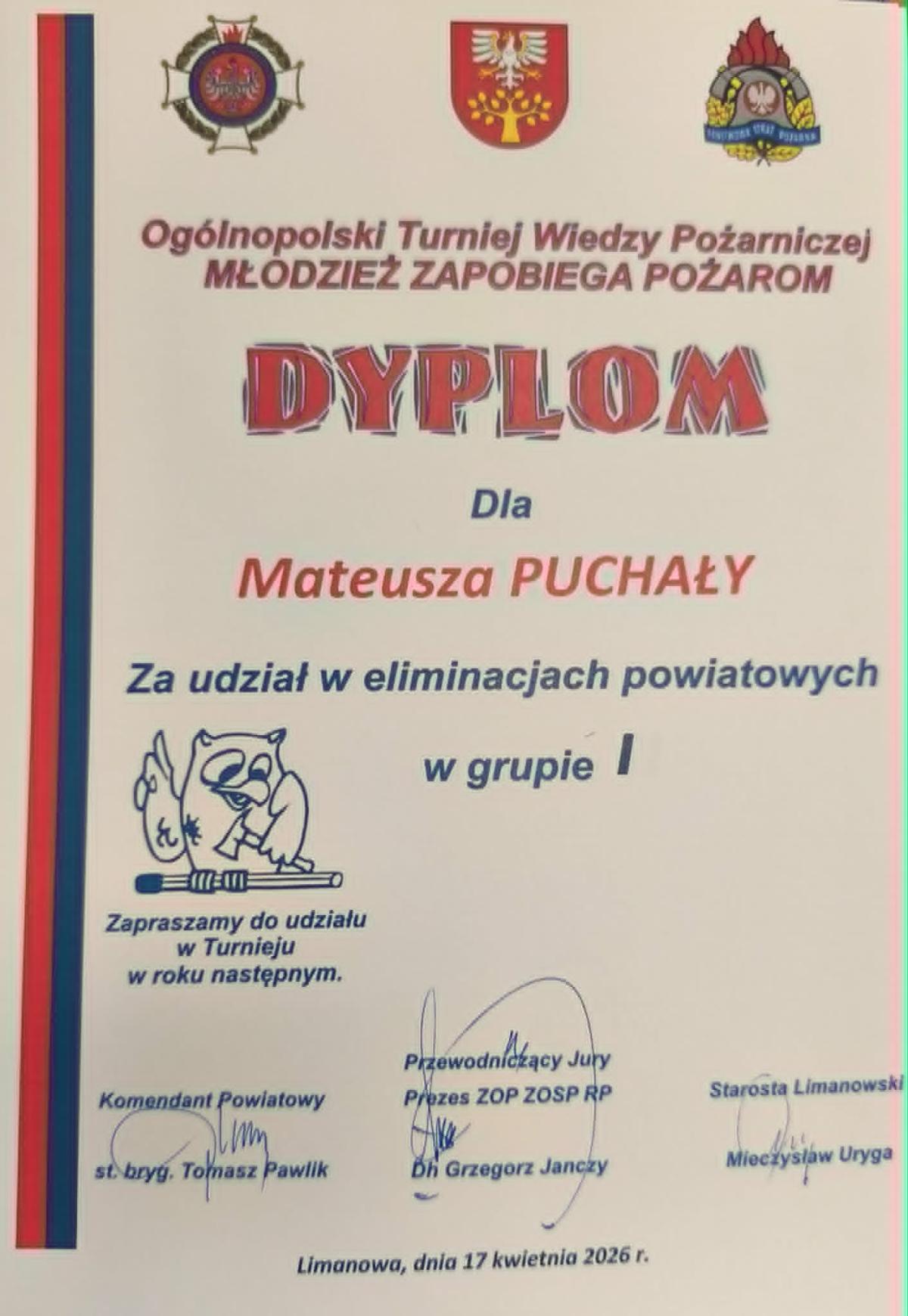 W dniu 17 kwietnia 2026 r. w siedzibie Komendy Powiatowej Państwowej Straży Pożarnej w Limanowej odbył się finał powiatowy Ogólnopolskiego Turnieju Wiedzy Pożarniczej pod hasłem „Młodzież Zapobiega Pożarom”. Wydarzenie, zorganizowane przez Zarząd Oddziału Powiatowego Związku OSP RP oraz Starostwo Powiatowe w Limanowej, zgromadziło 42 najlepszych zawodników wyłonionych w eliminacjach gminnych.